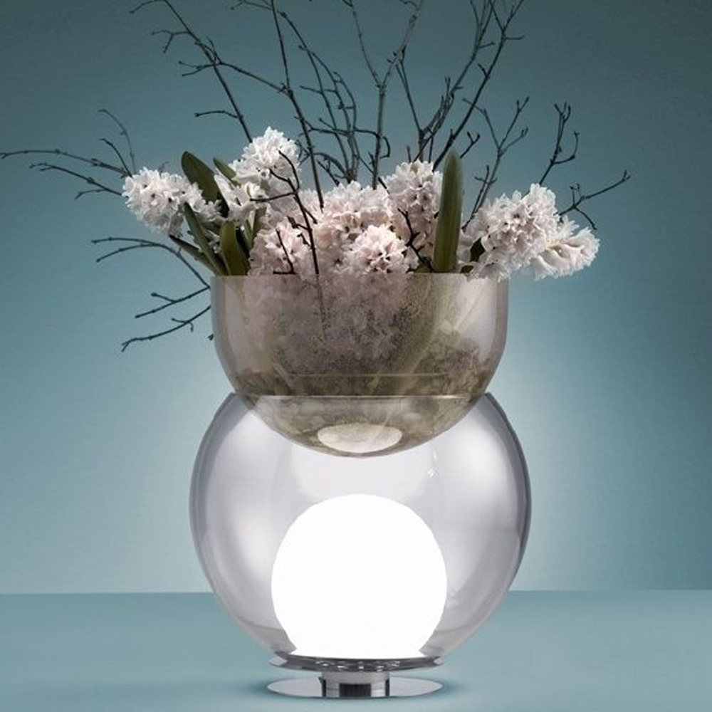 Lampada/portafiori da tavolo. Base in metallo cromato. Sfera centrale in vetro trasparente soffiato. Sfera interna in vetro bianco opalino lucido. Semisfera superiore in vetro soffiato rosa con bollicine decorative. Cavo di alimentazione, interruttore e spina nera.