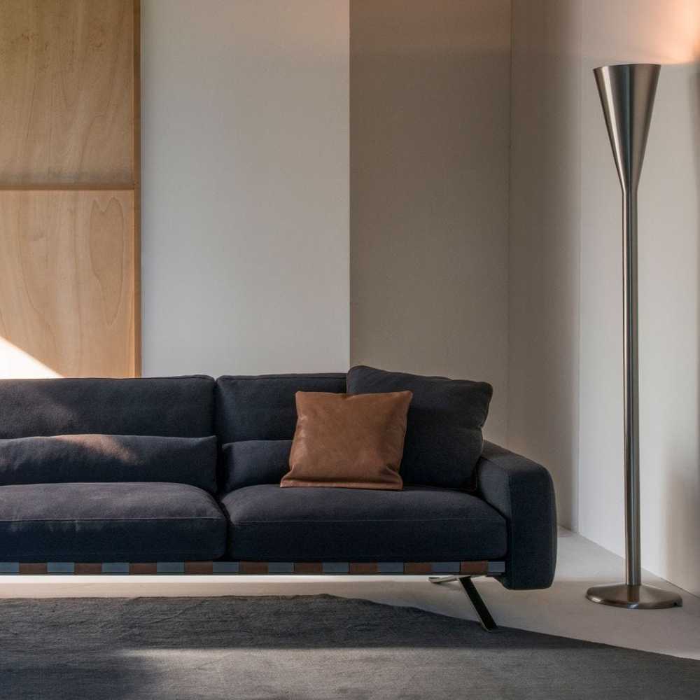 Luminator è uno dei primi progetti che Pietro Chiesa, già titolare a Milano di una bottega artigiana specializzata nella lavorazione artistica del vetro, firma per FontanaArte, di cui diventa direttore artistico affiancando Gio Ponti. Prima lampada da terra ad illuminazione indiretta, Luminator è composta da un sottile fusto metallico che si apre a cono e al cui interno si trova la sorgente luminosa. Unico elemento che poggia su una base circolare, è una lampada di un rigore e una purezza quasi astratte. In assoluto, uno dei pezzi più straordinari disegnati da Pietro Chiesa. Ora disponibile colore blu metallico e bianco e con sorgente luminosa a Led.