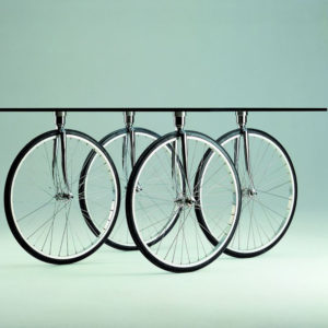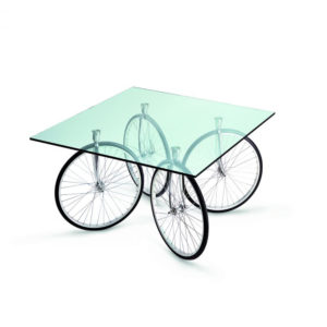 Tour rappresenta la declinazione successiva del Tavolo con Ruote. Dotato anch’esso di ruote, in questo caso di bicicletta, è un pezzo sorprendente. Il piano in vetro float molato, dello spessore di 15 mm, poggia su 4 ruote pivottanti fissate al piano mediante quattro piattelli in acciaio inox. Le forcelle sono cromate e le ruote sono rivestite di gomma.