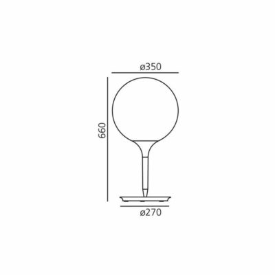Il design del diffusore sferico viene esaltato dalla presenza di uno stelo luminoso, dalla linea morbida e affusolata, che costituisce il dolce passaggio dalla luce intensa del diffusore alla zona d’ombra della struttura della lampada. Base in zama, stelo in resina termoplastica, diffusore in vetro soffiato.
