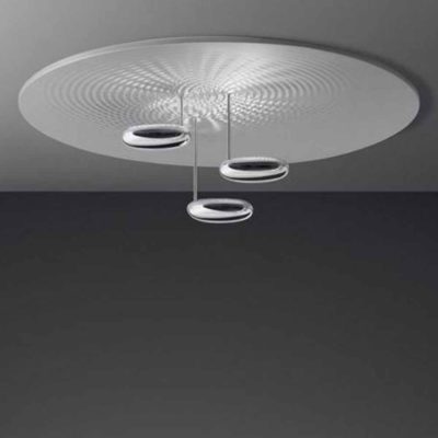 “Droplet è una lampada che assomiglia a una pozza di alluminio liquido che riflette tre ciotoli chiari. È stata creata totalmente in digitale e sembra congelare nel tempo le increspature che si incrociano per definire le zone di riflessione, agendo come una forma di liquido dicroico”. Materiali: corpi luminosi in alluminio pressofuso; riflettore in alluminio stampato e verniciato.