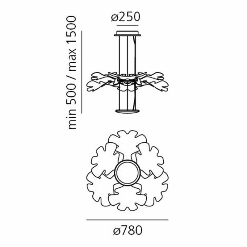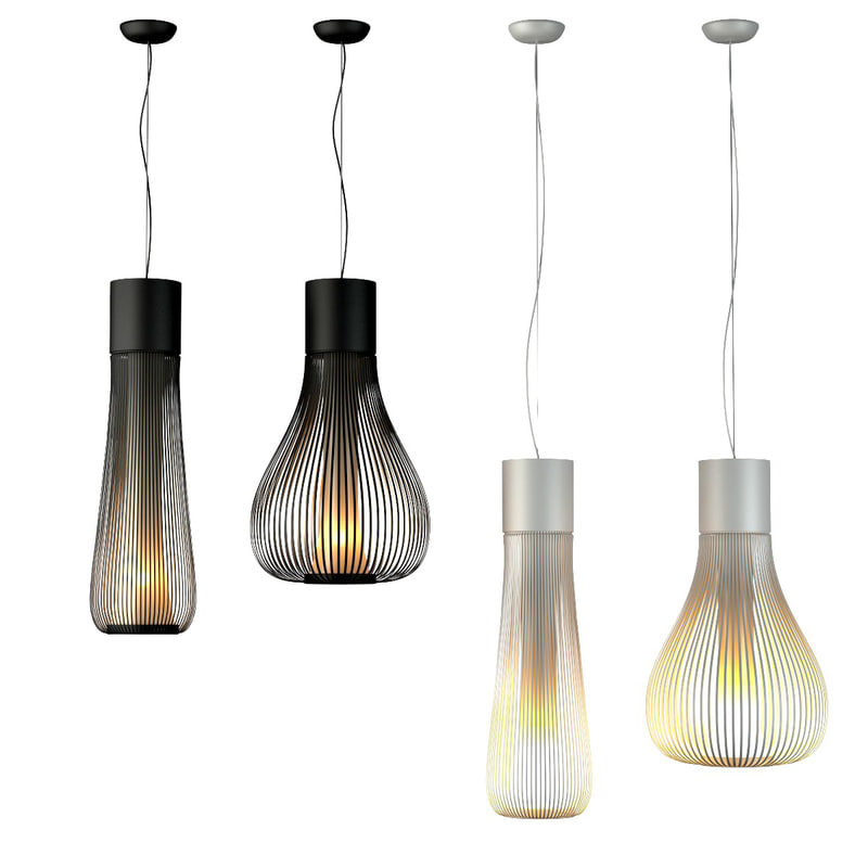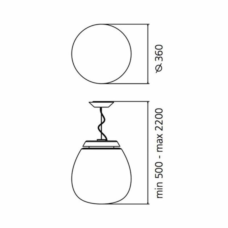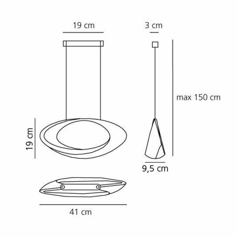 Sospensione verticale. Rosone per il collegamento elettrico a soffitto centrato in finitura bianca. Alimentatore dimmerabile. Integratore led.